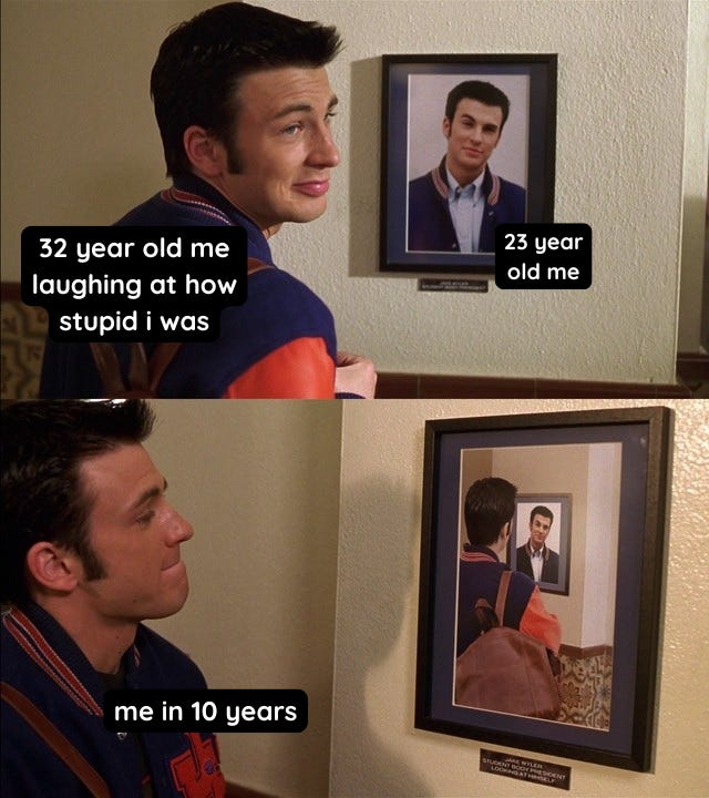 I’m only 32 years old, so I have to assume that there’s still a lot that I still don’t know. But I do know this: in the same way that I’m marveling at my 23-year-old self, which is the same way that she marveled at my teenage self, a 45-year-old version of me will be doing the exact same thing to the me of now.